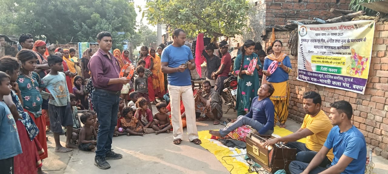 दिनांक 3 नवम्बर 2025 को खिलाफत चौसा, यादव मोड़, वार्ड संख्या 04, ब्लॉक चौसा, जिला बक्सर में एक कार्यक्रम आयोजित किया गया। इस कार्यक्रम में M/s भारती कला मंच, बक्सर की टीम ने नुक्कड़ नाटक और गीत-संगीत के माध्यम से स्थानीय लोगों को मतदान के महत्व और लोकतांत्रिक प्रक्रिया के प्रति जागरूक किया। कार्यक्रम का उद्देश्य लोगों को मतदान के प्रति सजग बनाना और लोकतंत्र में उनकी भागीदारी को बढ़ावा देना था।