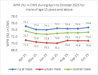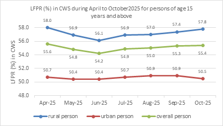 The overall LFPR among persons of age 15 years and above continued to increase for the four successive months to 55.4% in October, 2025 from 54.2% in June, 2025. The LFPR in rural areas has also increased steadily from 56.1% observed in June, 2025 to 57.8% in October, 2025.