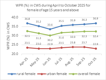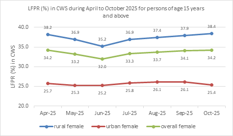 - Growth continues in female labour force participation: The overall LFPR among female aged 15 years and above reached 34.2% in October, 2025 marking the highest since May, 2025 driven by the increase in female LFPR in rural areas.