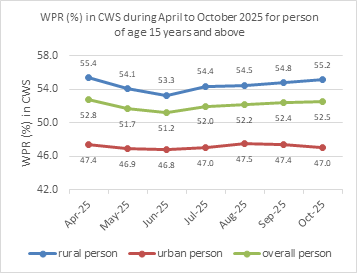 - The overall Worker Population Ratio (WPR) in October, 2025 reported as 52.5% which is consistently rising since June, 2025 among persons of age 15 years and above.