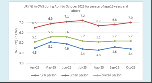 - Overall Unemployment Rate (UR) remains unchanged: The UR among persons of age 15 years and above remained unchanged at 5.2% between September, 2025 and October, 2025. A marginal decline in the rural Unemployment Rate (UR), from 4.6% in September, 2025 to 4.4% in October, 2025, coupled with a moderate rise in urban UR from 6.8% to 7.0%, resulted in overall stability in the unemployment rate among persons aged 15 years and above.