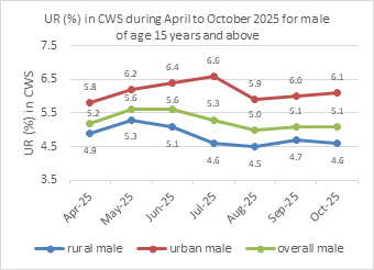 Male UR has remained stable at 5.1% in October, 2025 as compared to previous month. A minor decrease in rural male UR, from 4.7% in September, 2025 to 4.6% in October, 2025, was offset by a slight rise in urban male UR from 6.0% to 6.1% during the same period, which contributed to overall stability.