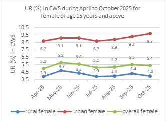 UR among female of age 15 years and above declined to 5.4% in October, 2025 from 5.5% observed during September, 2025. The drop in UR among rural female, from 4.3% in September, 2025 to 4.0% in October, 2025, mainly contributed towards decline in overall female UR.