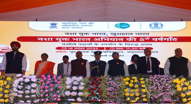 The Nasha Mukt Bharat Abhiyaan (NMBA), one of the world’s largest community-driven drug demand reduction movements, today completed five successful years with a grand national celebration at Guru Nanak Dev University, Amritsar. The event, attended by over 10,000 participants including school and college students, BSF personnel, Self-Help Groups, spiritual organisations, youth clubs and NGOs, was graced by Hon’ble Governor of Punjab Shri Gulab Chand Kataria and Hon’ble Union Minister for Social Justice and Empowerment Dr. Virendra Kumar.