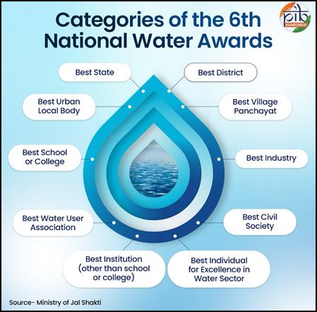 The 6th National Water Awards for the year 2024 were officially launched on 23rd October 2024. The initiative drew an impressive 751 applications, from which 46 winners, including joint awardees, have been chosen across 10 different categories with the awards being conferred on 18th November, 2025. Maharashtra secured the first rank under the Best State category, followed by Gujarat in second place and Haryana in third.