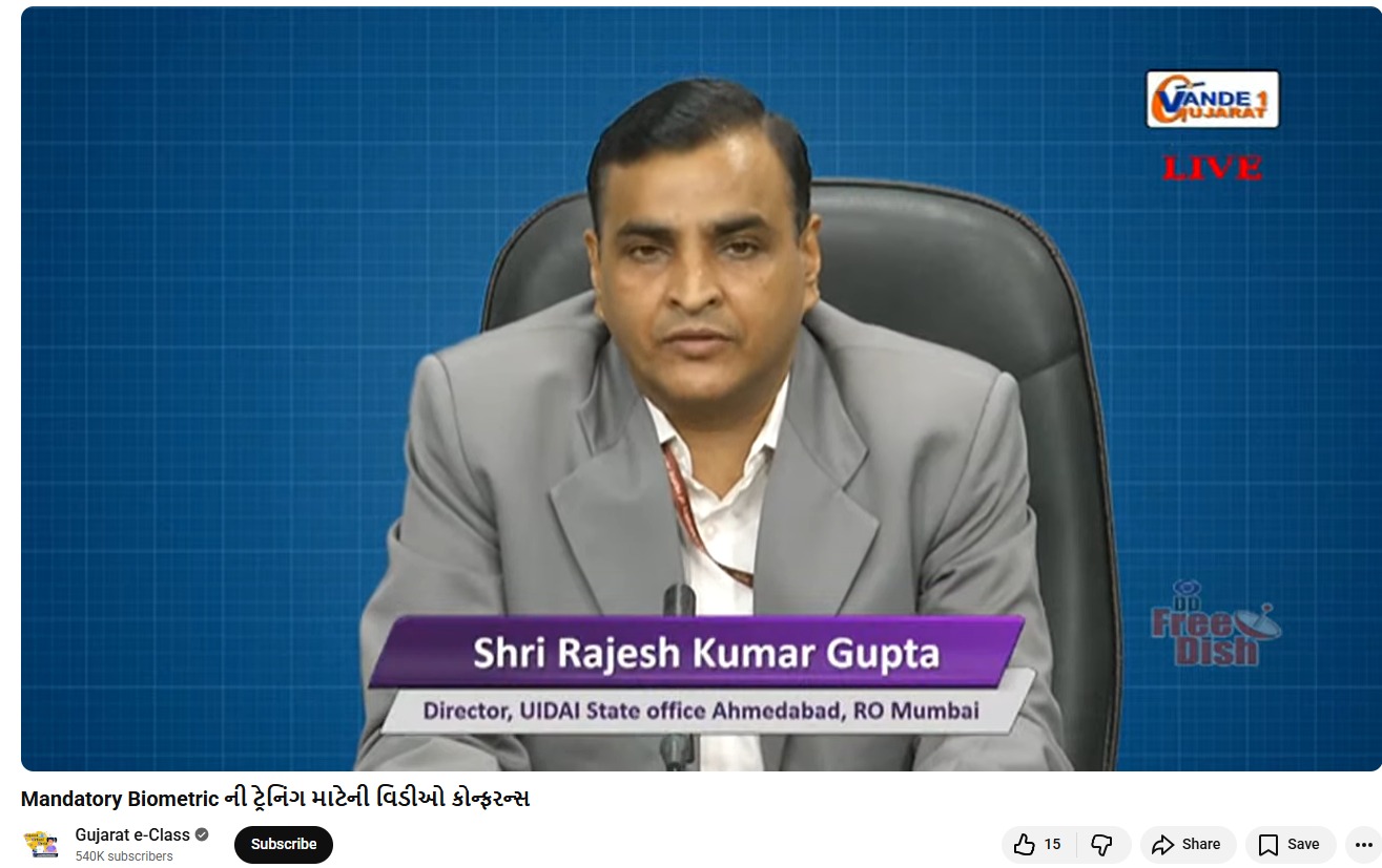 A state-level video conference hosted at BISAG-N was successfully streamed live on YouTube and Vande Gujarat TV channel, organised by the UIDAI State Office, Ahmedabad in close coordination with the Education Department, Government of Gujarat.