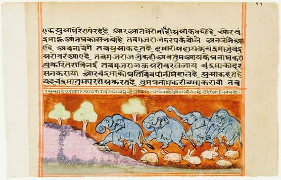 Figure 7: 18th century Panchatantra manuscript page, The Elephants Trample the Hares