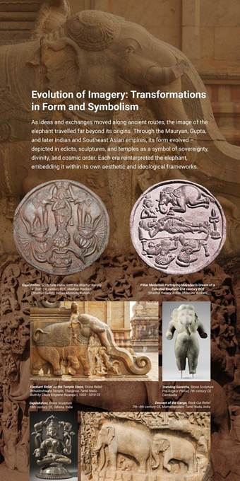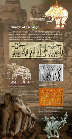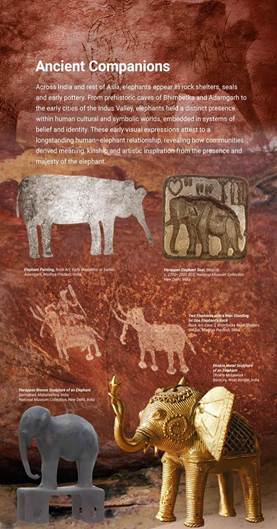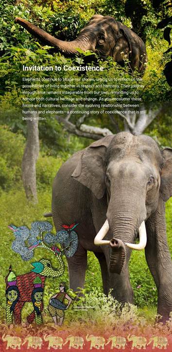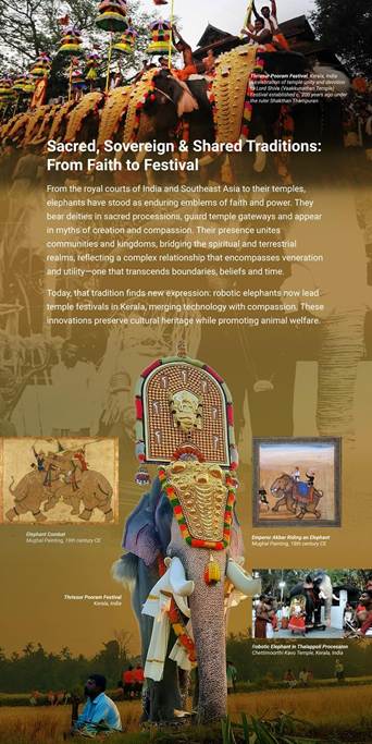 The exhibition presents six thematic panels that showcase the enduring human-elephant relationship—from prehistoric art and ancient trade routes to evolving elephant imagery and sacred traditions—revealing how elephants have shaped belief, power, and cultural exchange across Asia. It highlights both historic continuity and modern innovations like Kerala’s robotic temple elephants, inviting viewers to reflect on compassion, heritage, and the possibilities of coexistence today.