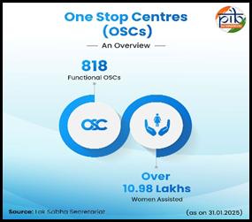 महिला एवं बाल विकास मंत्रालय ने 01 अप्रैल, 2015 से वन स्टॉप सेंटर (ओएससी) योजना भी लागू की है। ये ओएससी हिंसा से प्रभावित या पीड़ित महिलाओं को पुलिस, चिकित्सा और कानूनी सहायता तथा परामर्श, मनो-सामाजिक परामर्श और अस्थायी आश्रय सहित एक ही छत के नीचे कई एकीकृत सेवाएं प्रदान करते हैं। 2015 से जिला स्तर पर ओएससी की स्थापना ने हिंसा और संकट का सामना करने वाली महिलाओं को समय पर समर्थन और सहायता के लिए एक समर्पित मंच प्रदान किया है, जो पहले मौजूद अंतर को भरता है।
