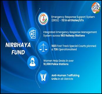 सरकार निर्भया फंड के अंतर्गत आपातकालीन प्रतिक्रिया सहायता प्रणाली (ई आर एस एस) भी लागू करती है। यह एक अखिल भारतीय, एकल, अंतरराष्ट्रीय स्तर पर मान्यता प्राप्त नंबर है, यानी, पुलिस, अग्निशमन और एम्बुलेंस सेवाओं जैसी विभिन्न आपात स्थितियों के लिए 112 आधारित प्रणाली है, जिसमें संकट के स्थान पर फील्ड संसाधनों को कंप्यूटर सहायता से भेजा जाता है। इसे 36 राज्यों/केंद्रशासित प्रदेशों में क्रियान्वित किया गया है।