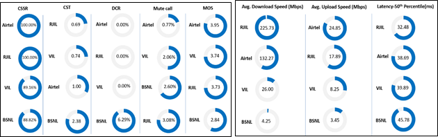कॉल सेटअप सफलता दर: एयरटेल, बीएसएनएल, आरजेआईएल और वीआईएल की ऑटो-सिलेक्शन मोड (5जी/4जी /3जी /2 जी) में कॉल सेटअप सफलता दर क्रमशः 100.00 प्रतिशत, 88.82 प्रतिशत, 100.00 प्रतिशत और 89.16 प्रतिशत है।