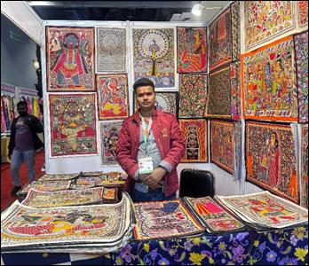 बिहार के पवेलियन में मधुबनी चित्रकला के जीवंत रंग तुरंत ही आंखों को आकर्षित करते हैं और इस प्रदर्शनी के केंद्र में बिहार के जितवारपुर गांव के 18 वर्षीय मधुरम कुमार झा हैं जो इस कला का पर्याय बन गए हैं।