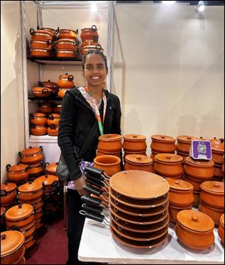 राजस्थान पवेलियन में, टेराकोटा के बर्तनों की कतारें, तेज रोशनी में चमक रही हैं। उनके बीच 20 वर्षीय करिश्मा परजापत खड़ी हैं, जो मृदुभाषी होने के साथ-साथ आत्मविश्वास से भरी हैं और अपने परिवार की लंबे समय से चली आ रही मिट्टी के बर्तन बनाने की कला का प्रतिनिधित्व कर रही हैं।