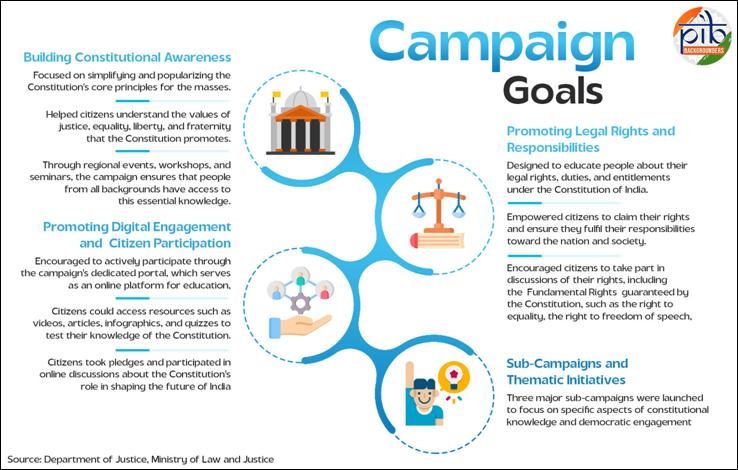 এই উদ্যোগগুলির মূল লক্ষ্য হল, সংবিধানের মূল্যবোধগুলিকে সাধারণ মানুষের জন্য সরল করা, আইনি স্বাক্ষরতা বাড়ানো এবং ন্যায় সহায়তার মাধ্যমে নাগরিকদের মধ্যে সংবিধান সম্পর্কে গভীর সচেতনতা ও গর্ব তৈরি করা।