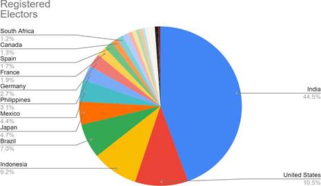 अंतर्राष्ट्रीय आईडीईए के सदस्य और पर्यवेक्षक देशों में कुल मतदाता = 2,225,549,481 (222.5 करोड़)