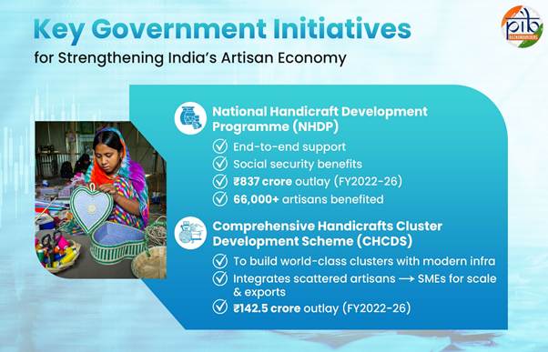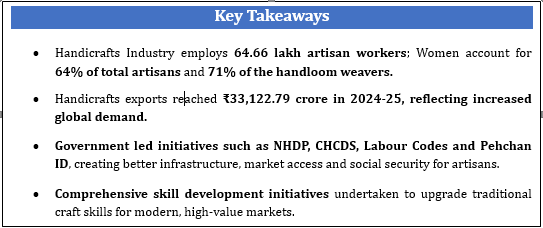 India’s handicraft sector plays a crucial role in the country’s economy and cultural identity. By supporting millions of artisans across rural and semi-urban areas, it reflects India’s deep reservoir of traditional skills and craftsmanship. With growing global interest in handmade and sustainable products, the sector has strong potential for expansion.Government initiatives & schemes, covering skill training, cluster development, marketing support, digital platforms, and export facilitation, are aimed at creating better opportunities for artisans and helping them access wider markets. These interventions are improving productivity, strengthening value chains, and enabling artisans to earn more predictable and higher incomes.