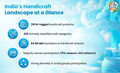 India’s handicraft sector plays a vital role in the country’s economy, especially in rural areas. It provides livelihoods to a large number of artisans and craftspersons across rural and semi-urban regions, contributes to exports, and helps preserve India’s rich cultural heritage.With 318 GI-tagged handicraft products and around 455 formally classified craft categories, the sector reflects the remarkable diversity of India’s creative traditions.