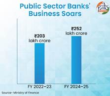 - From FY 22–23 to FY 24–25, the total Business of Public Sector Banks (PSBs) rose from ₹203 lakh crore to ₹252 lakh crore