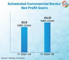 · Scheduled commercial banks continue to post strong earnings, with net profit increasing from ₹2.63 lakh crore in FY 2022–23 to ₹4.01 lakh crore in FY 2024–25.