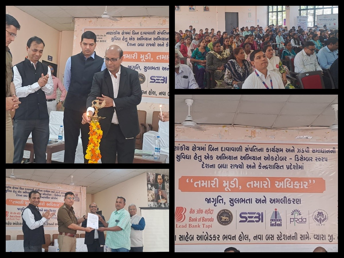 "તમારી મૂડી, તમારો અધિકાર" ટેગલાઇન સાથે દાવો ન કરાયેલ થાપણો પરત મેળવવા માટેની રાષ્ટ્રવ્યાપી ઝુંબેશ 1 ઓક્ટોબર 2025થી 31 ડિસેમ્બર 2025ના સમયગાળા દરમિયાન ચલાવવામાં આવી રહી છે આ ઝુંબેશનું તારીખ 04થી ઓક્ટોબર, 2025ના રોજ ગુજરાતના ગાંધીનગરમાં માનનીય કેન્દ્રીય નાણા મંત્રી શ્રીમતી નિર્મલા સીતારમણ દ્વારા કરવામાં આવ્યું હતું. આ અંતર્ગત વ્યારા ખાતે જિલ્લા કક્ષાની શિબિરનું સભાખંડ ડો.બાબાસાહેબ આંબેડકર ભવન હોલ વ્યારા ખાતે શુક્રવાર તારીખ 12મી ડીસેમ્બર 2025ના રોજ આયોજન કરવામાં આવ્યું હતું.