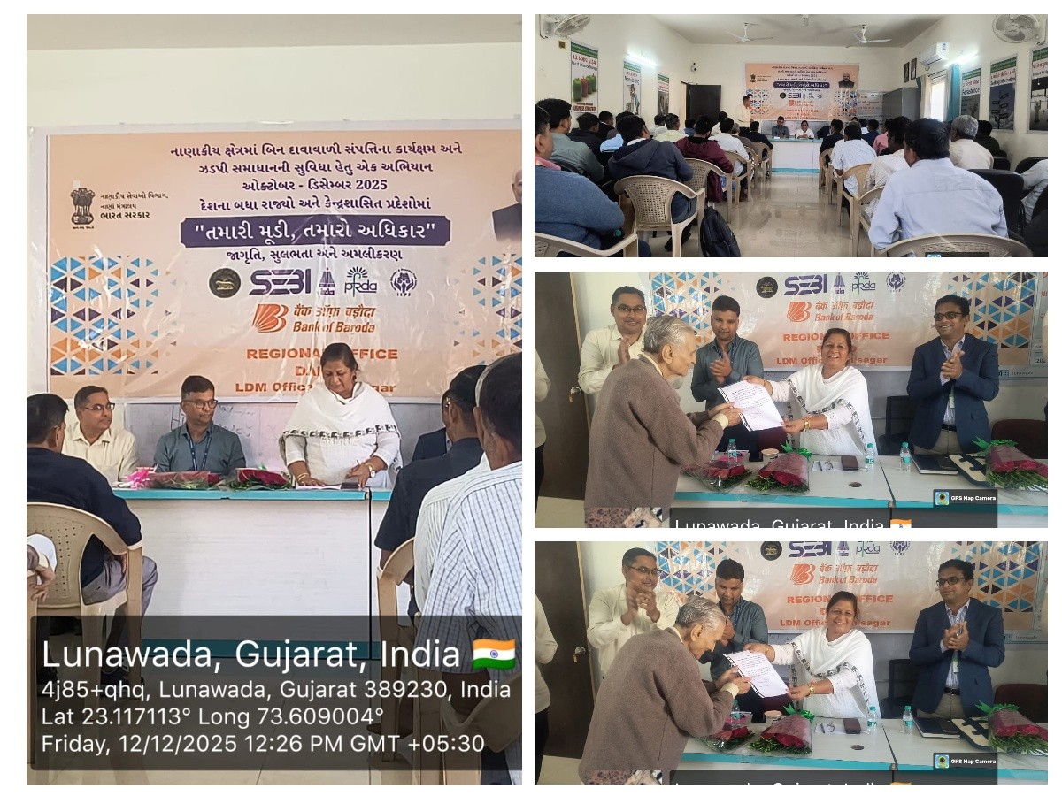 રાજ્યમાં આઠમા તબક્કામાં નાણાકીય સંસ્થાઓ દ્વારા દાવો ન કરાયેલ થાપણો પરત મેળવવા માટે અરવલ્લી, મહીસાગર, પંચમહાલ અને તાપી જિલ્લામાં શિબિરનું આયોજન કરાયું