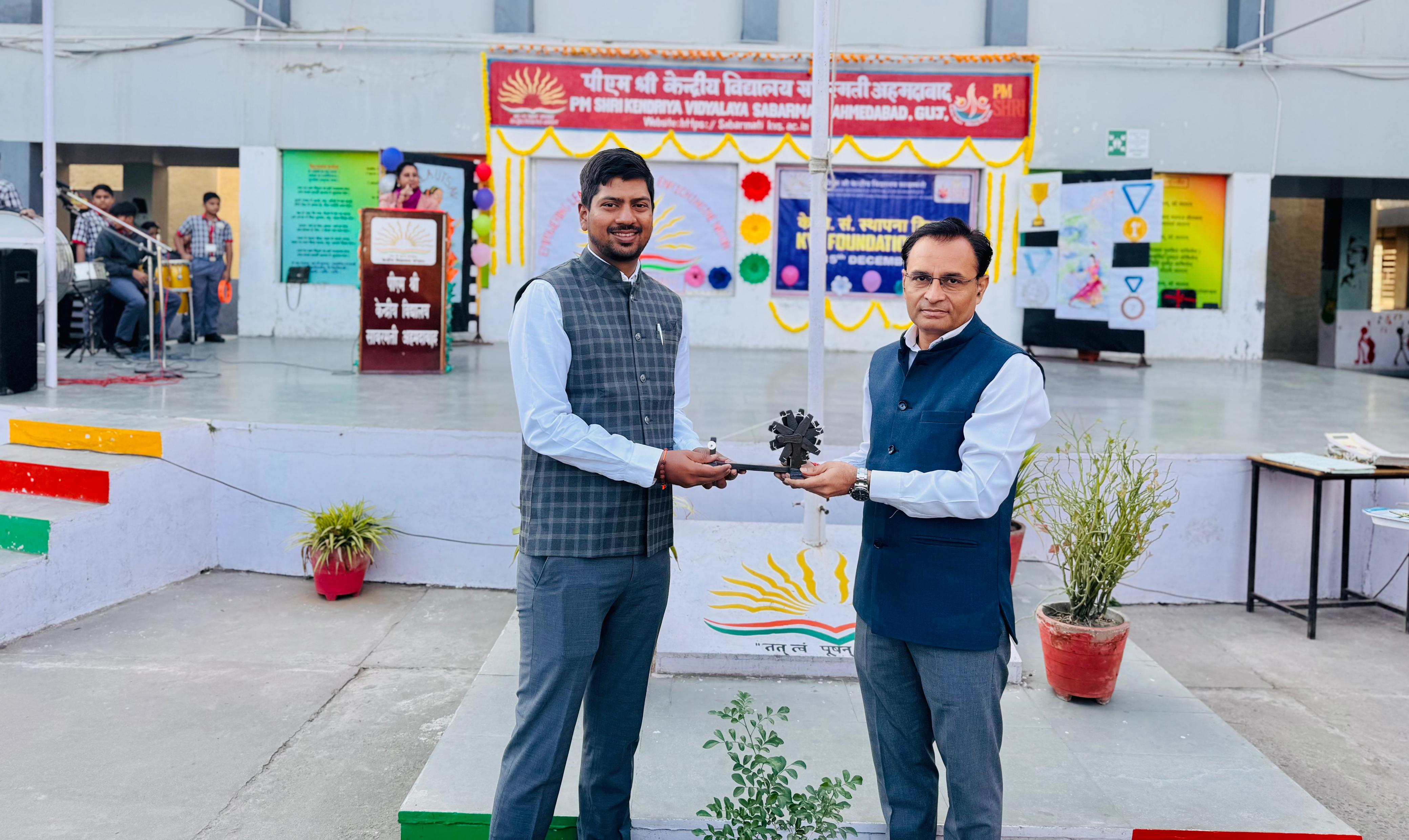 The Principal of PM SHRI Kendriya Vidyalaya Sabarmati, Mr. Deepak Singh Bhati, extended a warm green welcome to the Chief Guest, Mr. Lohit DME/DSL/SBI, along with former teachers and alumni of the school.