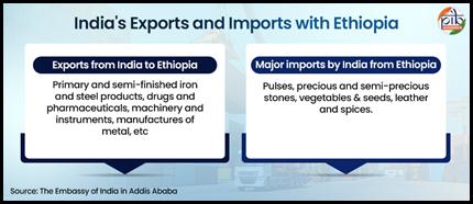 - India–Ethiopia total trade stood at US$ 550.19 million in FY 2024–25. Indian exports are US$ 476.81 million and imports US$ 73.38 million, making the relationship strongly export-driven.