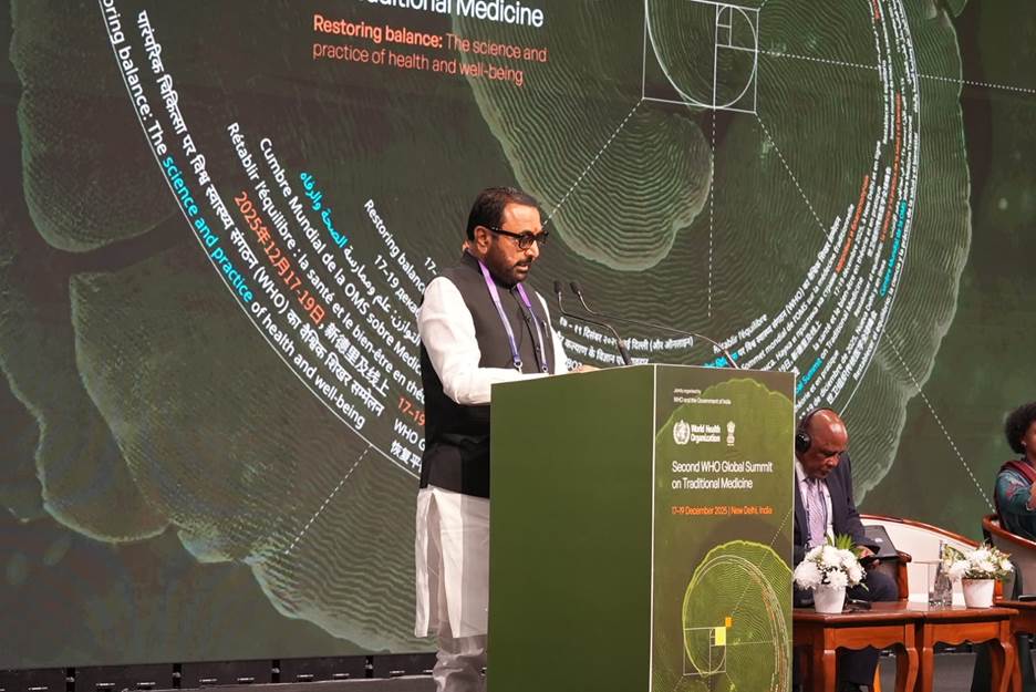 Union Minister of Health and Family Welfare Shri JP Nadda, in the presence of Union Minister Shri Prataprao Jadhav inaugurated the Second WHO Global Summit on Traditional Medicine at Bharat Mandapam, New Delhi today. Dr. Tedros Adhanom Ghebreyesus, Director-General, WHO, also shared a special video message that was played during the inaugural session. The session marks the beginning of the three-day mega global scientific congregation being held from 17th to 19th December 2025. Prime Minister Shri Narendra Modi is expected to grace the closing ceremony of the Summit on 19th December 2025. Centered on the theme “Restoring Balance: The Science and Practice of Health and Well-Being,” the summit is being jointly organized by the World Health Organization (WHO) and the Ministry of Ayush, Government of India. The event brings together policymakers, scientists, practitioners, Indigenous knowledge holders and civil society leaders from around the world to advance a shared vision of balanced, inclusive and sustainable health systems.