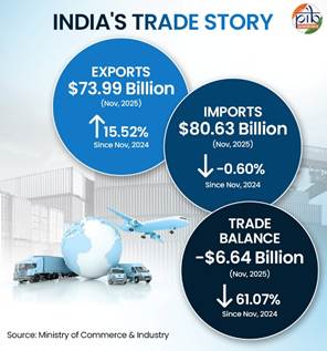 Between November 2024 and November 2025, India’s total exports rose from US$ 64.05 billion to US$ 73.99 billion, registering a strong 15.52% growth, while imports remained largely stable at US$ 80.63 billion. Consequently, the trade deficit narrowed significantly by 61.07%, from US$ 17.06 billion to US$ 6.64 billion.Despite trade disruption, this growth reflects India’s resilience, with high-value commodities, widening global partnerships, and policy reforms supporting a more balanced and globally integrated trade trajectory.