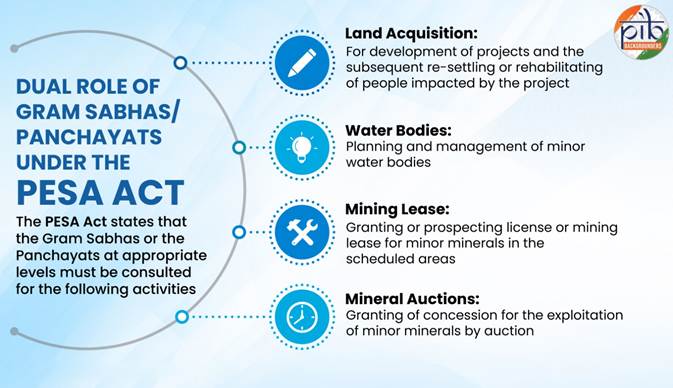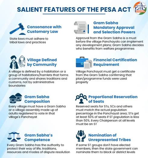 - The PESA Act empowers tribal communities by extending Panchayati Raj provisions to their scheduled lands, protecting them from being removed or alienated in their lands.