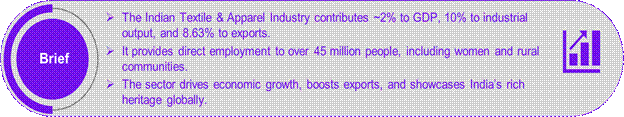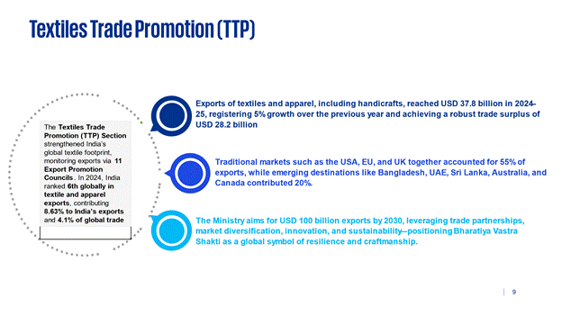 The Textiles Trade Promotion (TTP) Section has played a pivotal role in strengthening India’s global textile footprint, monitoring export performance through eleven Export Promotion Councils. In 2024India emerged as the 6th largest exporter of textiles and apparel, with the sector contributing a significant 8.63% share to India’s total exports and accounting for 4.1% of global trade.
