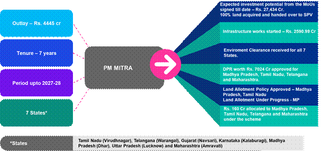 - DPR worth Rs. 7024 Cr. has been approved for PM MITRA Park Madhya Pradesh, Tamil Nadu, Telangana and Maharashtra.