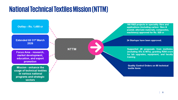 The Government has launched the National Technical Textiles Mission (NTTM) with an outlay of Rs. 1,480 crores, focusing on research, market development, education, and export promotion. The mission aims to enhance the usage of technical textiles in various national programs and strategic sectors and has been extended until 31stMarch 2026.