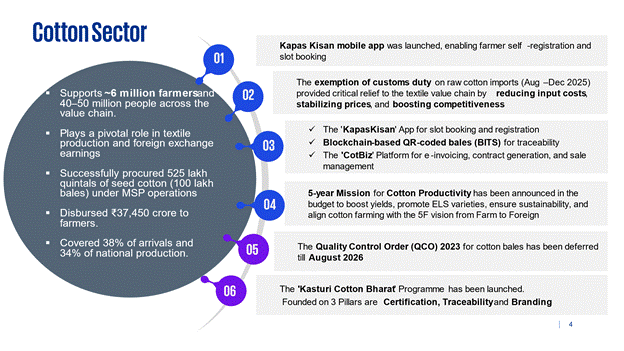 - The 'Kasturi Cotton Bharat' Programme has been launched, founded on the three pillars of Certification, Traceability, and Branding, to enhance the global market acceptance of Indian cotton. Collectively, these measures strengthen farmer welfare, stabilize markets, and reinforce India’s textile and apparel sector as a driver of employment and export growth.