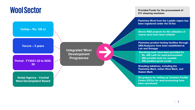 For the holistic growth of the Wool Sector, the Ministry of Textiles has formulated Integrated Wool Development Programme, (IWDP) for implementation during the period of 15thFinance Commission i.e., from FY 2021-22 to 2025-26 with total financial allocation of Rs. 126 Crore through approval of its SFC meeting held on 15th June 2021. IWDP scheme of MOT is Central Sector Scheme for Development of Wool Sector. Further, the Guidelines of IWDP has been approved by MoT and appointed Central Wool Development Board, Ministry of Textiles as nodal agency for implementation of this scheme in all major wool producing States.