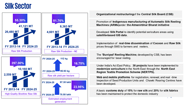 8.6 Under India's Act East Policy, 38 projects have been implemented to modernize sericulture in the North East through the North East Region Textile Promotion Scheme (NERTPS).