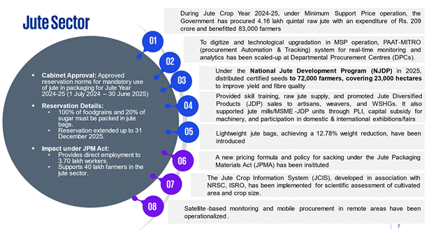 - During Jute Crop Year 2024-25, under Minimum Support Price operation, the Government has procured 4.16 lakh quintal raw jute with an expenditure of Rs. 209 crore and benefitted 83,000 farmers.