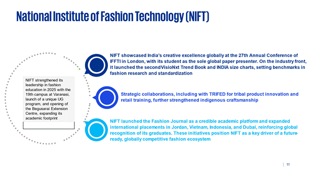 10.3 The launch of the NIFT Fashion Journal provided a credible academic platform, while expanding international placements in Jordan, Vietnam, Indonesia, and Dubai underscored the growing global recognition of NIFT graduates. Collectively, these initiatives highlight NIFT’s pivotal role in shaping a future-ready, globally competitive fashion ecosystem.