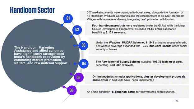11.1 307 marketing events were organized to boost sales, alongside the formation of 12 Handloom Producer Companies and the establishment of six Craft Handloom Villages with two more underway, integrating craft promotion with tourism.