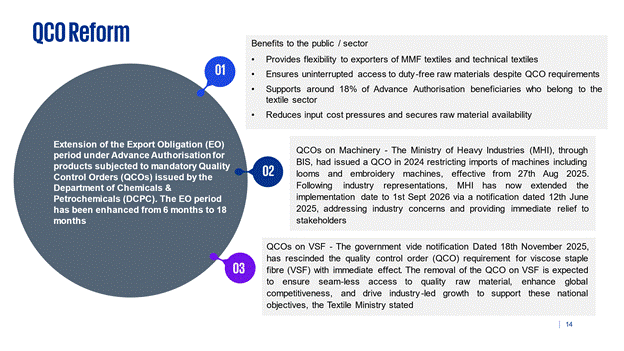 13.3 QCOs on VSF - The government vide notification Dated 18thNovember 2025, has rescinded the quality control order (QCO) requirement for viscose staple fibre (VSF) with immediate effect. The removal of the QCO on VSF is expected to ensure seam-less access to quality raw material, enhance global competitiveness, and drive industry-led growth to support these national objectives, the Textile Ministry stated.