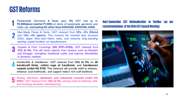15.4 Handicrafts & Handlooms: GST reduced from 12% to 5% on 36 handicraft items, cotton rugs of handloom, and handwoven carpets under HS 5705. This measure will provide relief to artisans, enhance rural livelihoods, and support India’s rich craft traditions.