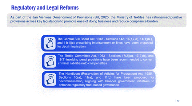 As part of the Jan Vishwas (Amendment of Provisions) Bill, 2025, the Ministry of Textiles has rationalised punitive provisions across key legislations to promote ease of doing business and reduce compliance burden.
