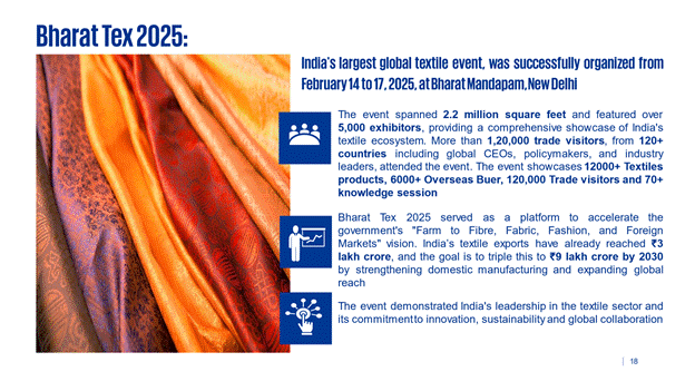 17.2 Bharat Tex 2025 served as a platform to accelerate the government's "Farm to Fibre, Fabric, Fashion, and Foreign Markets" vision. India’s textile exports have already reached ₹3 lakh crore, and the goal is to triple this to ₹9 lakh crore by 2030 by strengthening domestic manufacturing and expanding global reach.