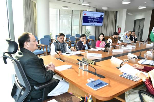 The Union Minister of Health & Family Welfare, Shri Jagat Prakash Nadda, today chaired a high-level review meeting with the Health Ministers and senior officials of Madhya Pradesh and Chhattisgarh to assess the status of healthcare delivery and accelerate the implementation of key national health programmes. The meeting focused on strengthening public health systems, enhancing patient satisfaction, improving regulatory oversight, and advancing the national goal of eliminating tuberculosis (TB) as a public health concern.