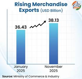India’s merchandise export performance in 2025 strengthened across major product groups and global markets. In the beginning, with exports valued at US$ 36.43 billion in January 2025, Indian exporters built on diversified demand conditions to sustain outward shipments throughout the year. Supported by strong contributions from sectors such as engineering goods, electronic goods, pharmaceuticals, gems & jewellery, and petroleum products, merchandise exports maintained a positive momentum, reflecting competitiveness of Indian manufacturing and trade linkages with global value chains. By November 2025, merchandise export value rose to US$ 38.13 billion, illustrating a consistent uptrend in external sector performance even during global trade disruptions.
