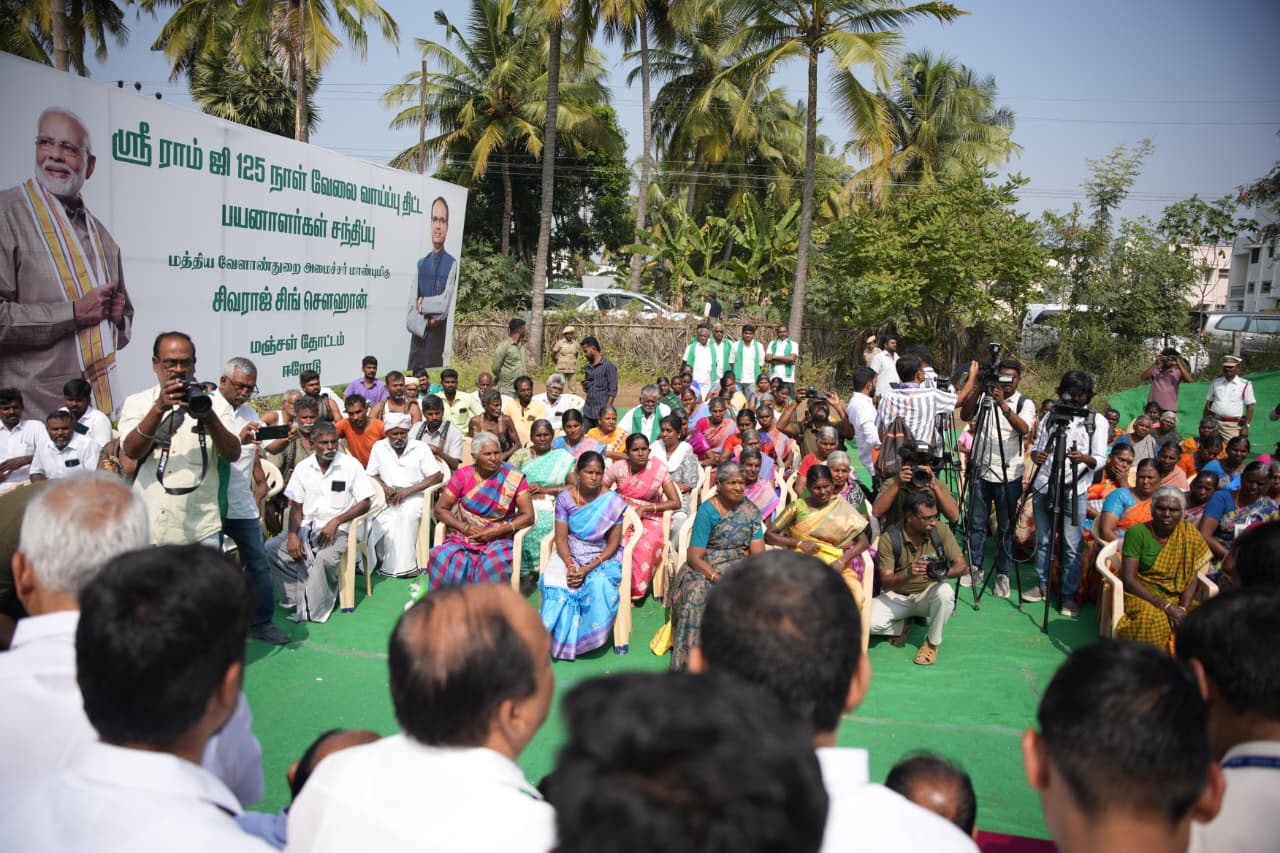 Union Minister of Agriculture and Farmers’ Welfare, and Rural Development, Shri Shivraj Singh Chouhan on Monday said in Erode, Tamil Nadu, that the ‘Viksit Bharat – G Ram G’ law is a significant step towards building self-reliant (Atmanirbhar) villages. Addressing workers and labourers in Erode, the Union Minister explained various provisions of this ambitious initiative, and said that the law is a concrete effort to strengthen employment generation, expand basic facilities, and promote self-sufficiency in villages. Shri Shivraj Singh Chouhan expressed confidence that the goal of developed and prosperous villages would be achieved only through public participation.