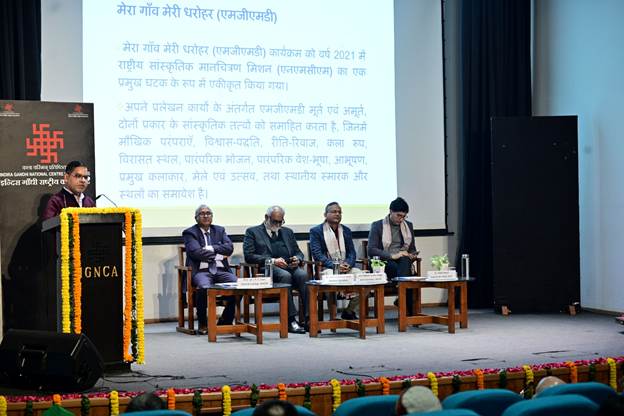 Welcoming the guests, Prof. Ramesh Gaur said that India is a land of festivals. When the sun moves northwards (Uttarayana), festivals like Makar Sankranti, Bihu, and Pongal are celebrated across the country. The National Mission on Cultural Mapping (NMCM) was also launched on Makar Sankranti in 2021. The Ministry of Culture, Government of India, entrusted the Indira Gandhi National Centre for the Arts (IGNCA) with the responsibility of the NMCM as the nodal agency. Dr. Mayank Shekhar then presented the department's annual report and highlighted its achievements. He also shared several important details about the 'Mera Gaon Meri Dharohar' (My Village, My Heritage) portal.