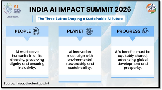 The India–AI Impact Summit 2026 aims to advance an impact-oriented and people-centric approach to Artificial Intelligence, with emphasis on delivering measurable social and economic outcomes. The Summit will be anchored on three foundational pillars, known as 'Sutras'—a Sanskrit term meaning guiding principles or essential threads that weave together wisdom and action. These Sutras define how AI can be harnessed through multilateral cooperation for collective benefit.