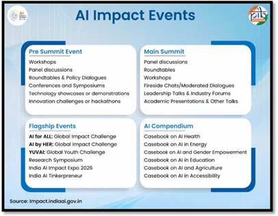 The objectives of the India–AI Impact Summit 2026 are operationalised by the AI Impact Events. The events provide structured platforms to present Indian AI initiatives, sectoral use cases, and institutional frameworks, while enabling feedback, peer learning, and international benchmarking.