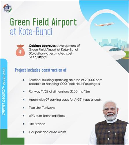 The Cabinet Committee on Economic Affairs, chair ed by the Prime Minister Shri Narendra Modi, approved the proposal of Airports Authority of India (AAI) for development of Green Field Airport at Kota-Bundi (Rajasthan) on August 19, 2025 at an estimated cost of Rs1,507.00 crore. The Government of Rajasthan has transferred 440.06 hectare land to AAI for development of a Greenfield Airport, suitable for operation of A-321 type aircraft. The project includes construction of a Terminal Building spanning an area of 20,000 square metres, capable of handling 1,000 Peak Hour Passengers (PHP) with annual capacity of 20 lakh Passengers Per Annum (MPPA).